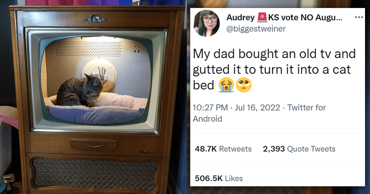 Twitter Thread Wholesome Dad Buys An Old Tv And Turns It Into The Purrfect Cat Bed I Can Has Cheezburger
